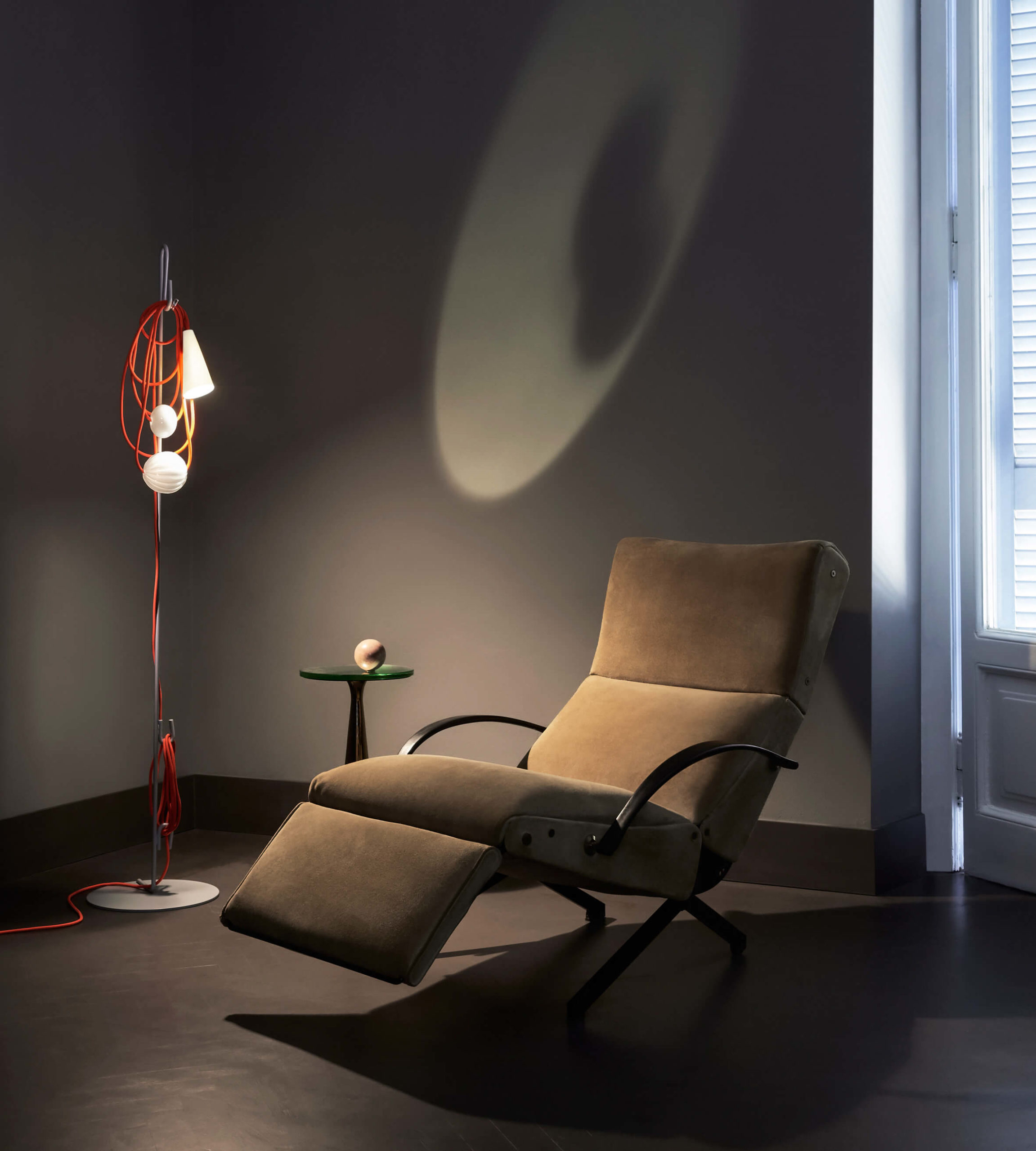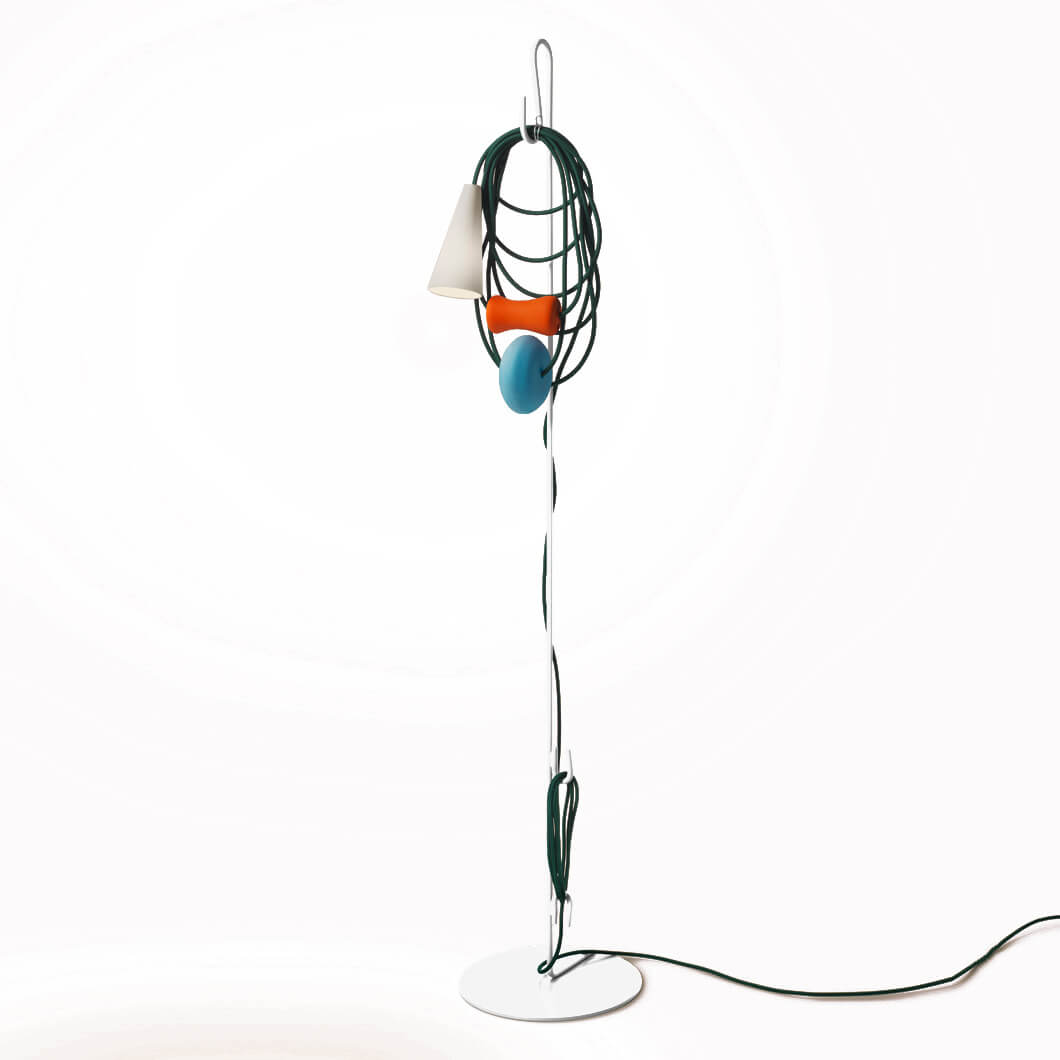 Hence the electrical wire establishes a dialogue with the parts in glass and the diffuser, in a rhythmical game of role swapping. While the energy that allows the lamp to perform its purpose as lighting runs along the cord, spheres and bulbs of glass also take their place there, transforming it into the archetype of a necklace, with a porcelain body in the form of a cone that projects the light on the wire and the glass spheres, ideally positioned as a pendent.
