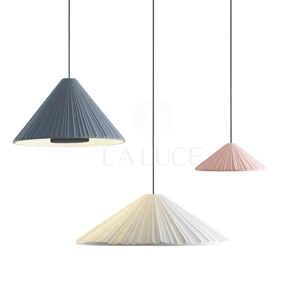 Ciò che distingue la collezione è l’utilizzo della ceramica e la sua lavorazione, che donano alla lampada un effetto delicato, simile al tessuto. Il designer e ceramista Xavier Mañosa ha creato una trama che evoca la seta pieghettata, applicata a un paralume conico, che proietta un raggio di illuminazione ampio e bellissimo.