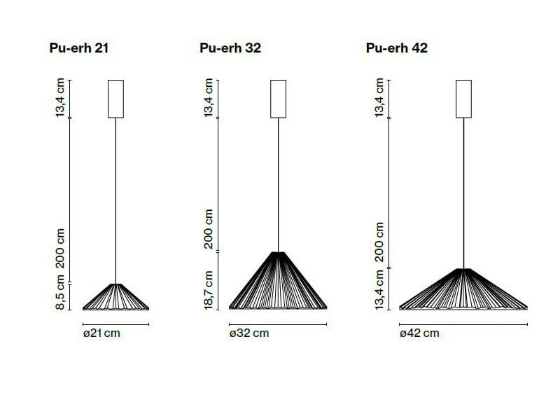 Questa collezione di lampade a sospensione è disponibile in tre dimensioni: 21, 32 e 42 cm e in un’ampia gamma di colori tenui che consentono di apprezzare la trama della ceramica: nero, bianco, blu, bordeaux e rosa. La luce emessa da Pu-erh è calda, suona e rimbalza all’interno del paralume e non disturba mai.