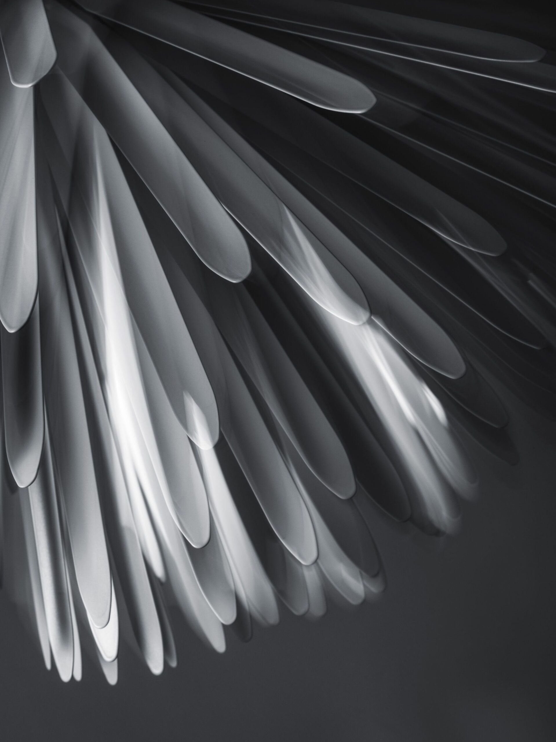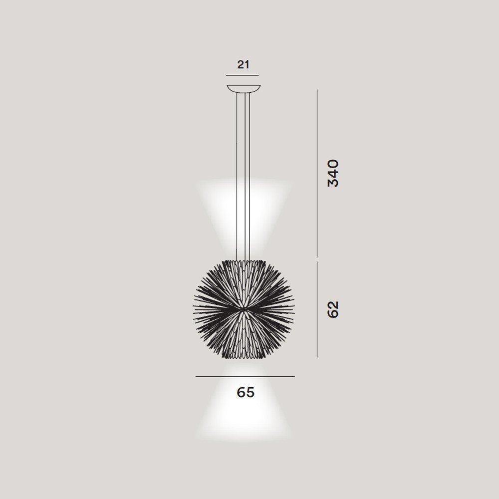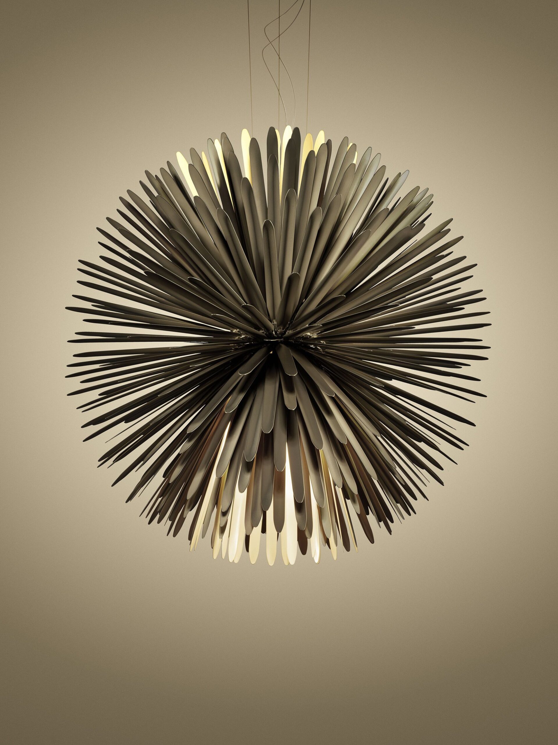 Come il sole dai contorni incandescenti e inafferrabili, Sun–Light of Love non ha un preciso inizio né fine: 390 raggi in metallo s’innestano sul corpo centrale di questa lampada a sospensione, dotandolo di una forma indefinita che lo sguardo ricompone nell’immagine di una sfera.