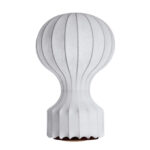 Realizzata in due dimensioni, questa storica lampada da tavolo disegnata da Achille e Pier Giacomo Castiglioni è il risultato di una delle prime applicazioni del Cocoon, una resina che, spruzzata intorno alla struttura di filo di acciaio, ne determina la forma, diffondendo una luce calda.