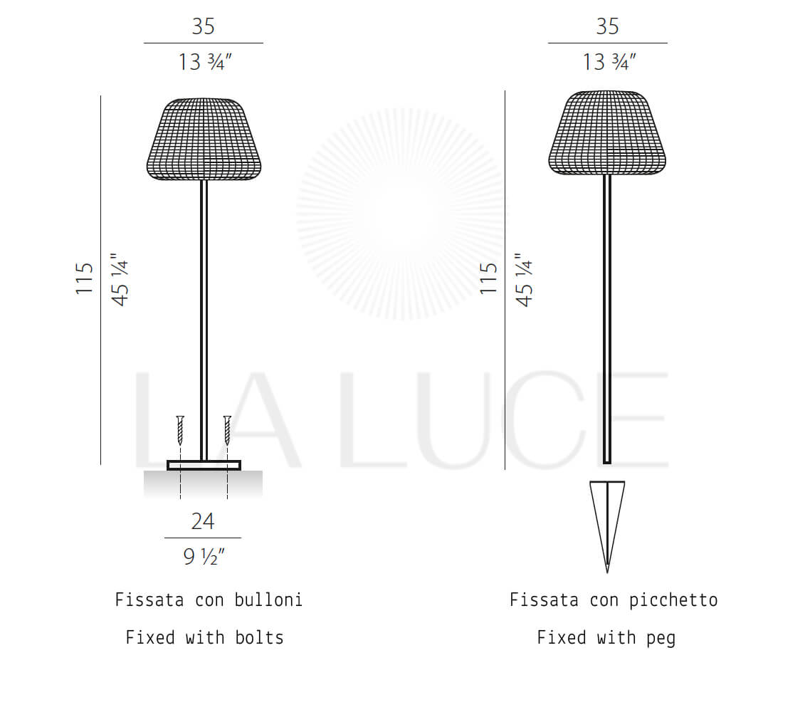 Lampshade available in striated white/grey or brown color. Stem finished with polyacrylic paint in white or brown. Diffuser with bayonet fitting designed for an easy removal during the winter. Ideal for outdoor living areas or garden lighting.