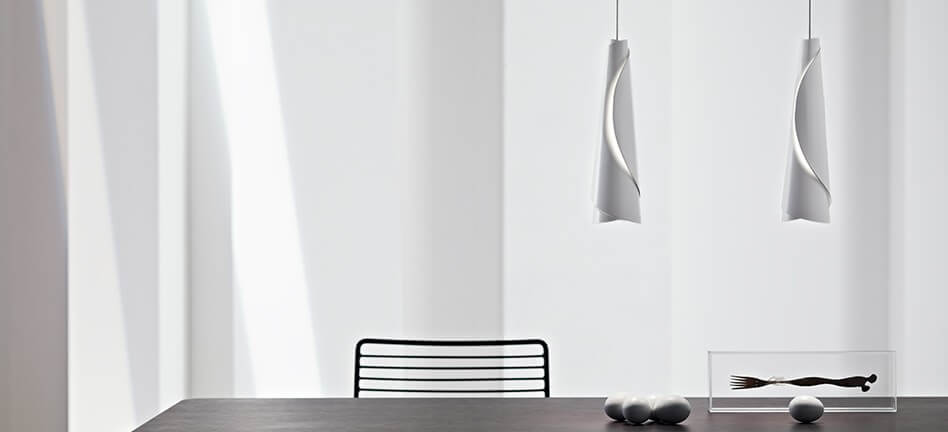 A small suspension light in lacquered alluminium available in two colours: classic white and warm, intense grey. It provides direct, precise light. The dual lighting effect that characterises Maki creates a suggestive theatrical effect.
