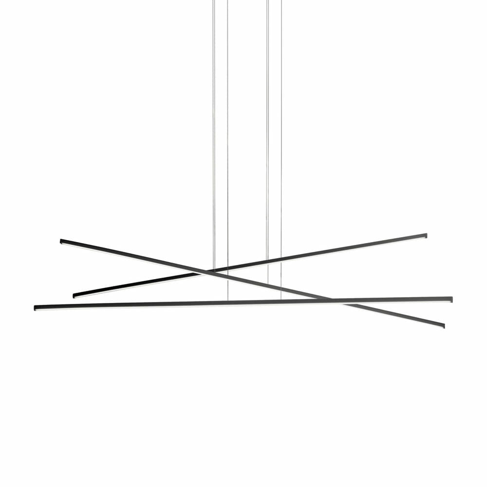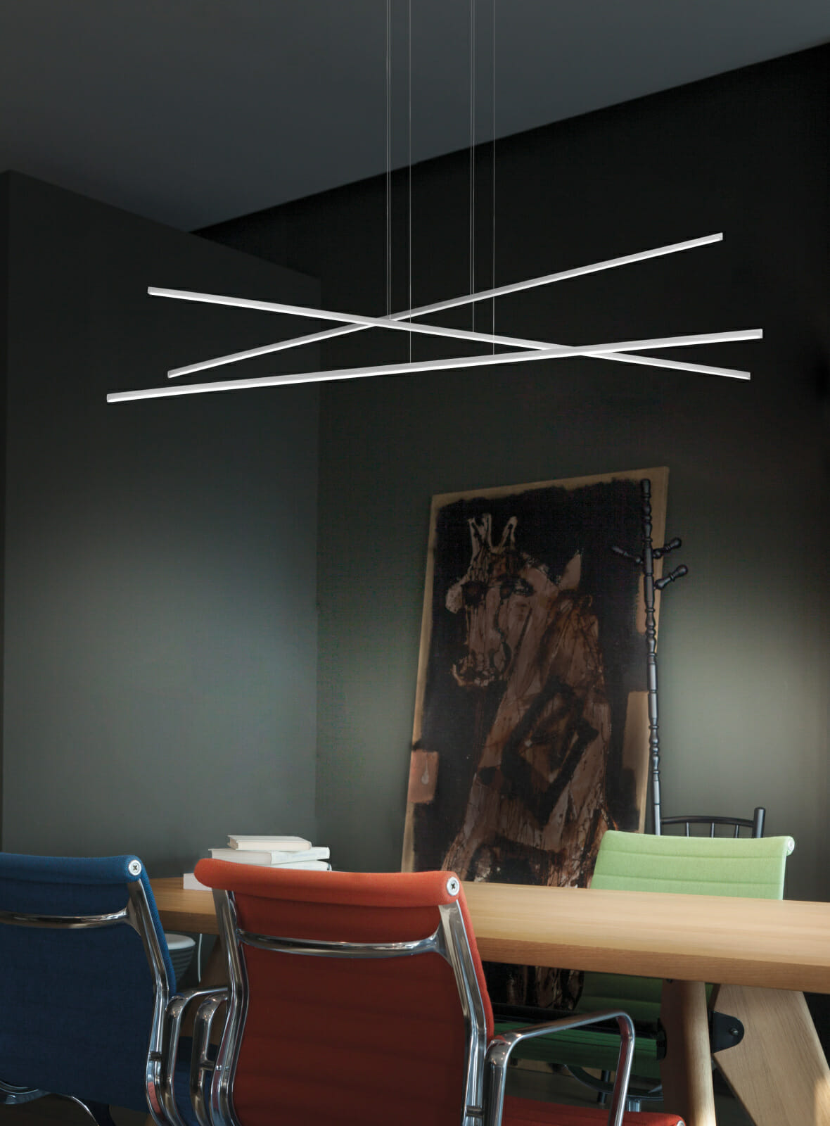 Linear essence. One or three extra thin light lines, freely combinable suspension. With its simplicity, everything is stylishly minimal. Materials: white or black wrinkled coating setting, polycarbonate diffuser.