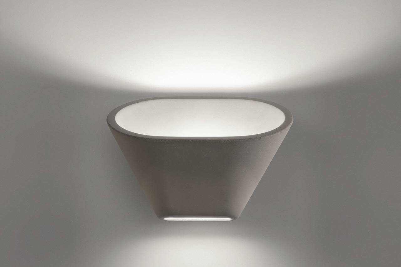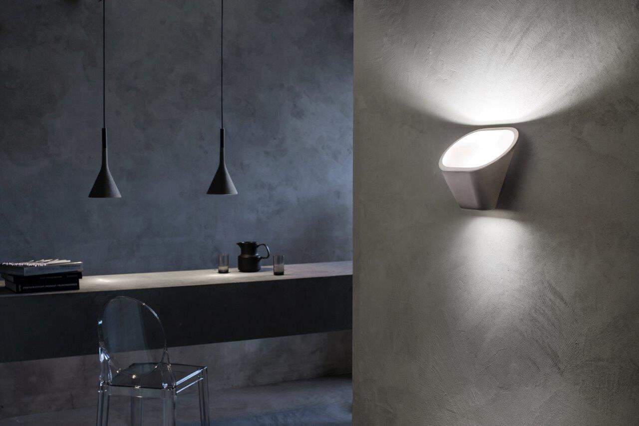 Made of rough concrete, the Aplomb wall lamp is characterized by an oblique movement of thediffuser which merges into and dialogues with its supporting structure, allowing for wider ranging light diffusion. The beam of light directed upwards is reflected onto the walls and ceiling, lighting up the room without ever dazzling. The more delicate beam of light directed downwards, by contrast, creates a sophisticated interplay of light on the walls. Aplomb wall lamp is available in grey, white and brown. It is ideal in all rooms that speak a direct, minimalist architectural language.