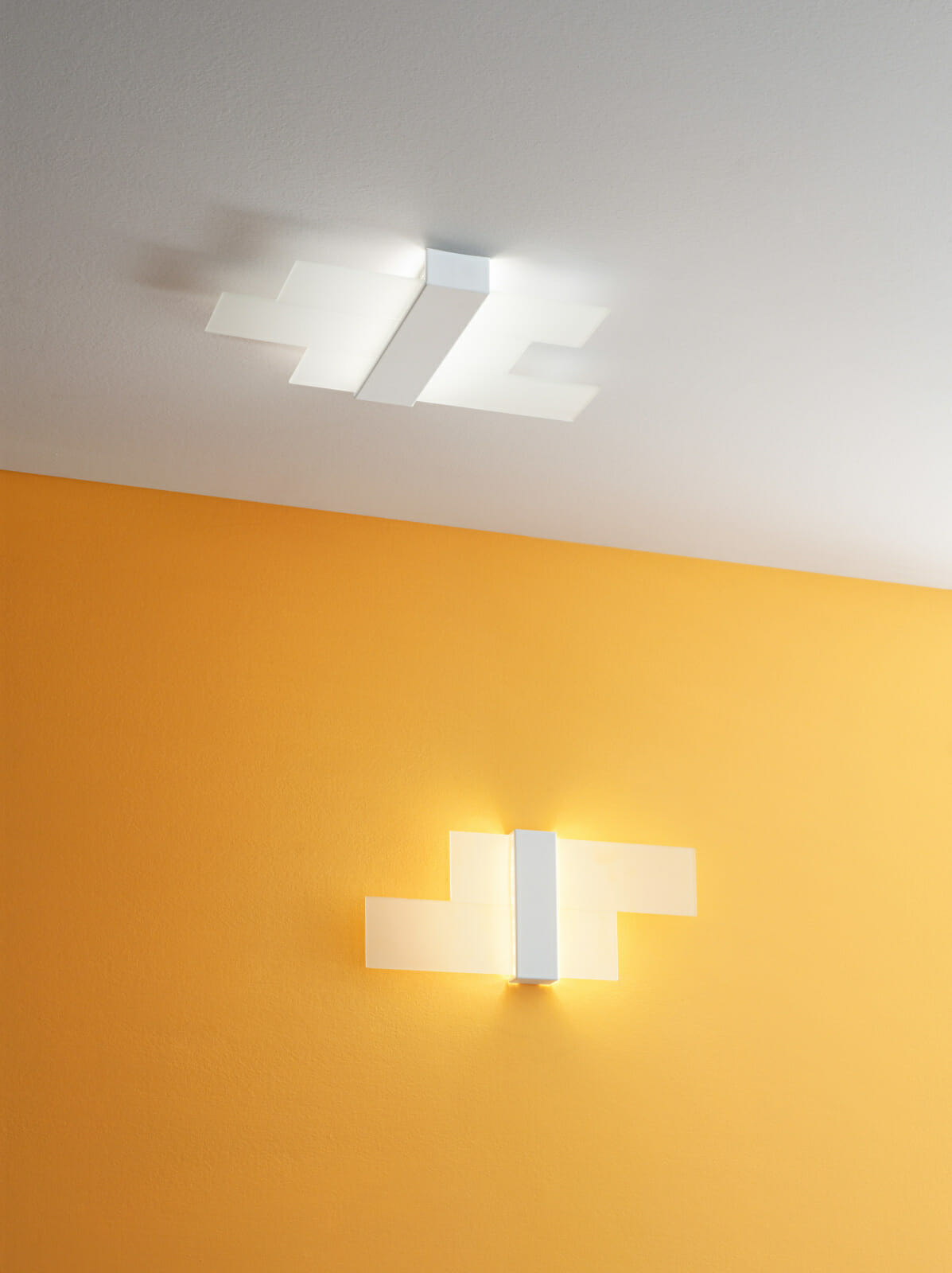 A movement, an interweaving of geometric elements that fit the wall or ceiling, playing with the room’s design, furnishing interiors with their physicality.
